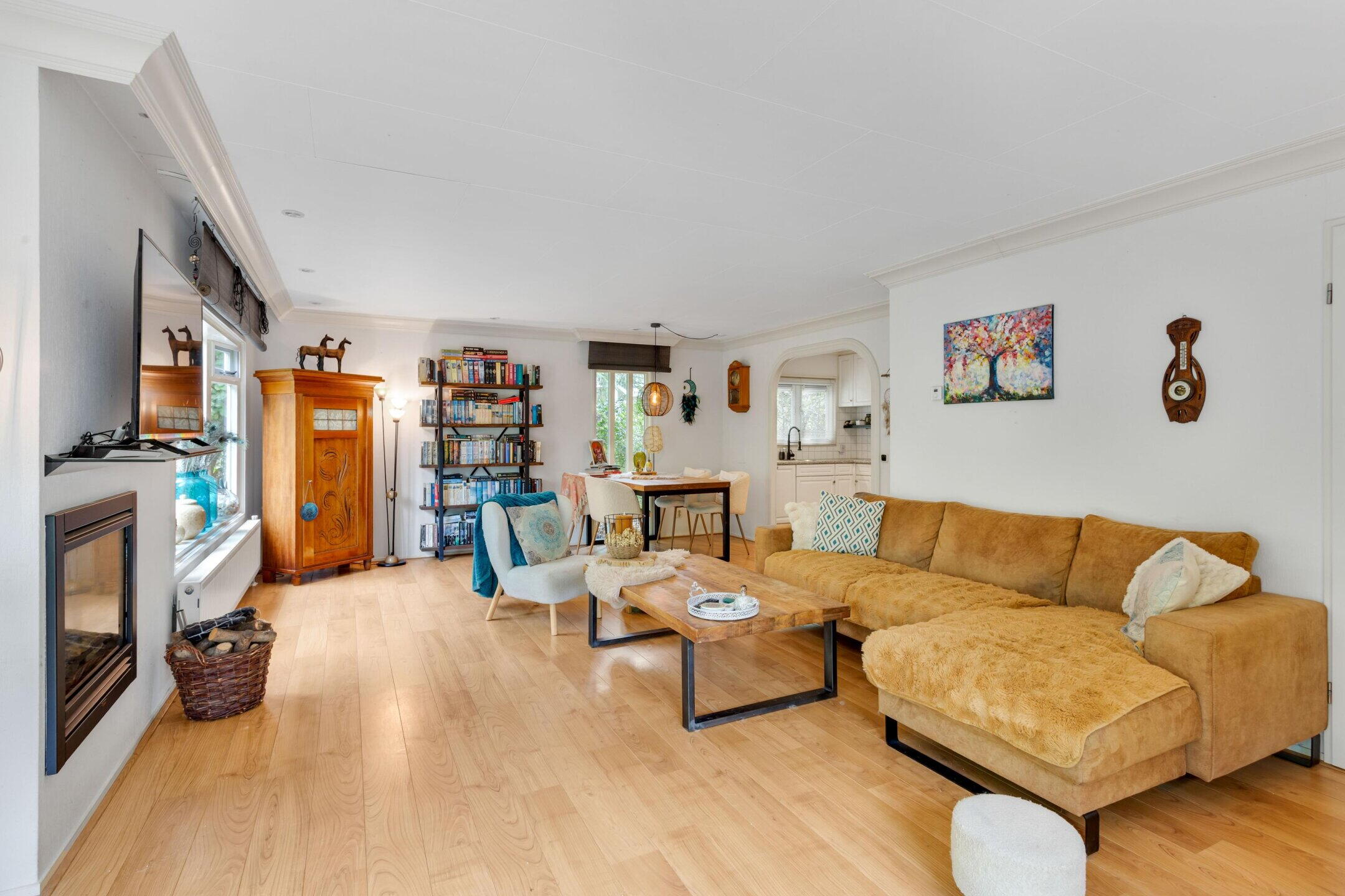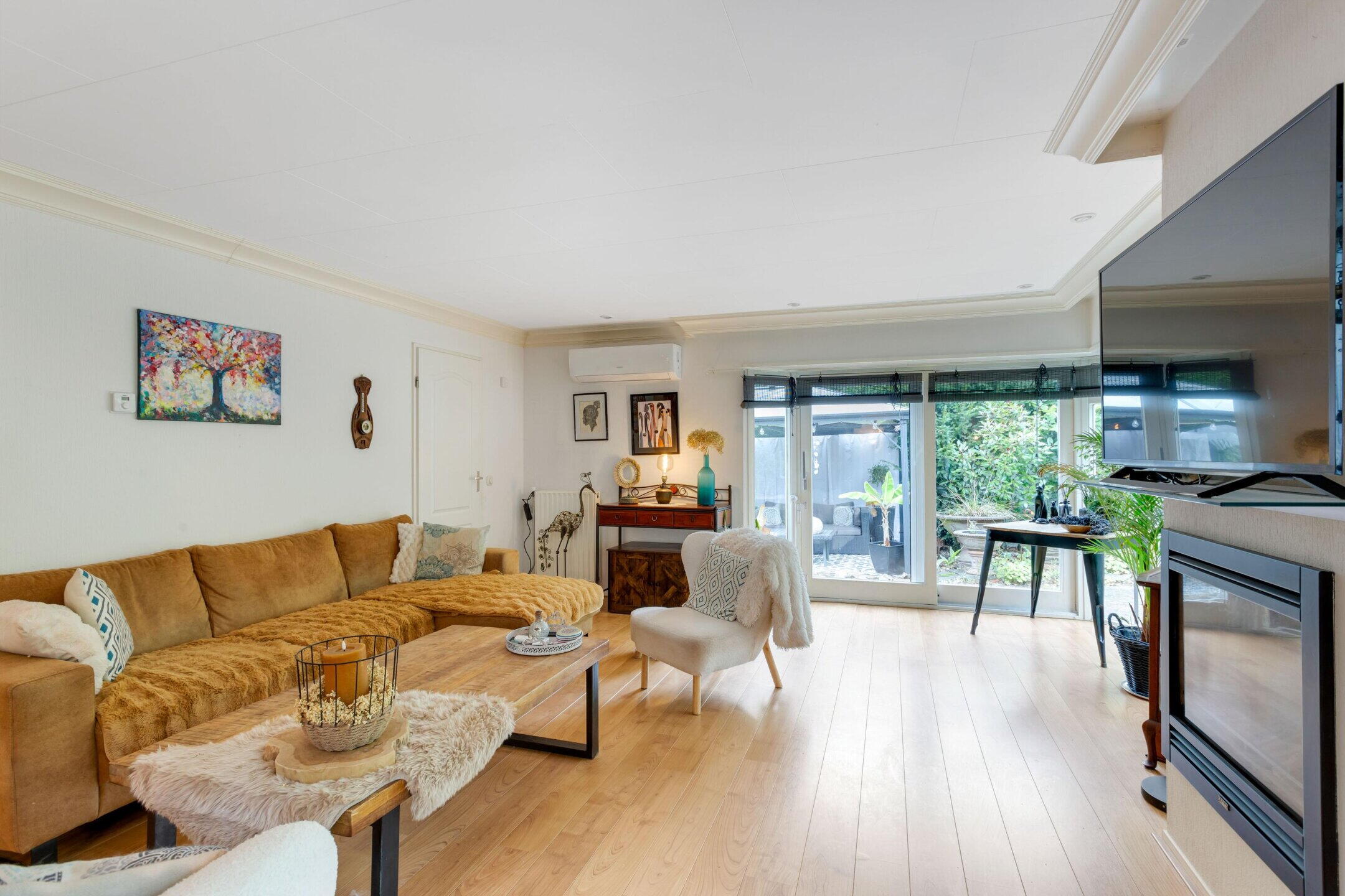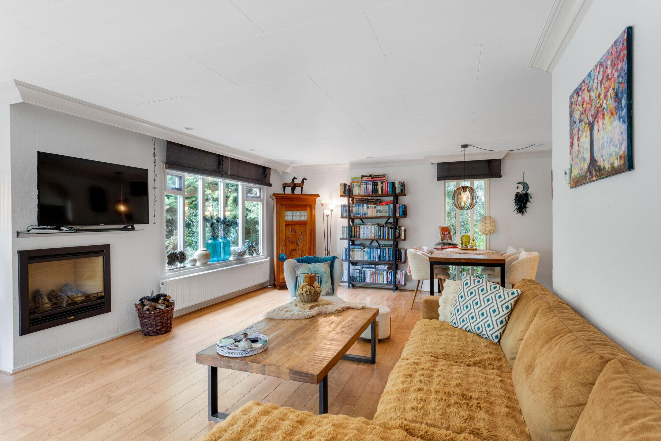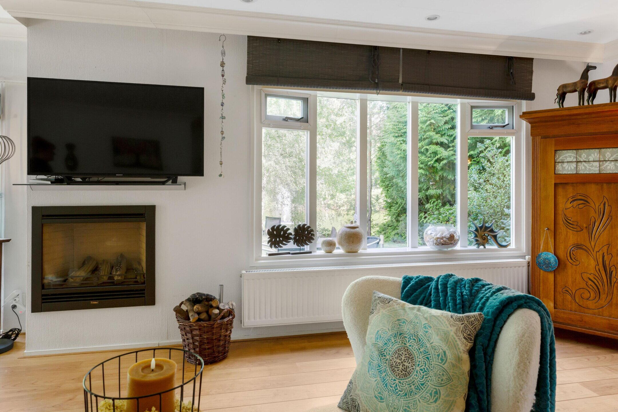 - Woonkamer met schuifpui, airco (koelen & verwarmen) en Faber gashaard