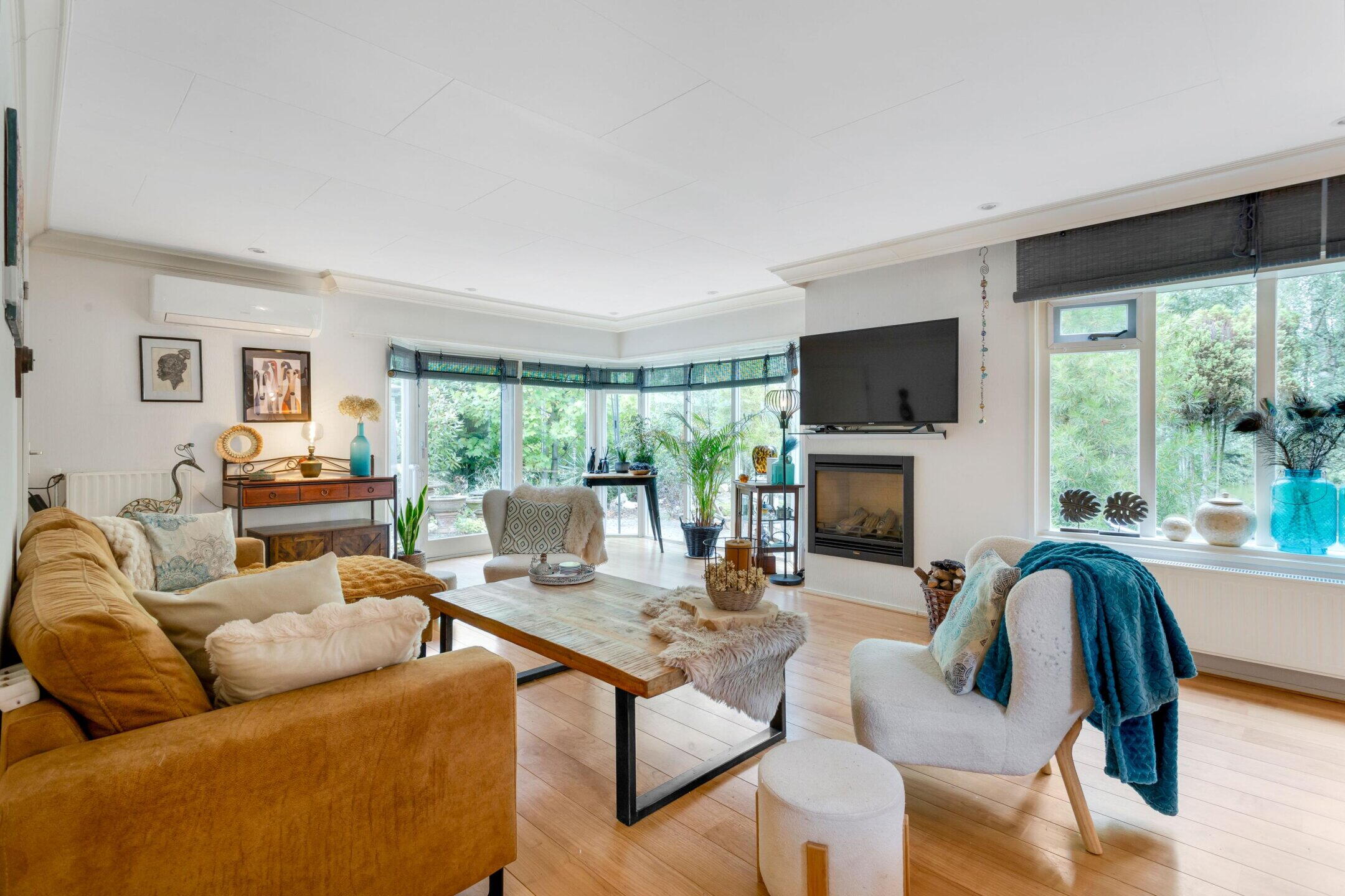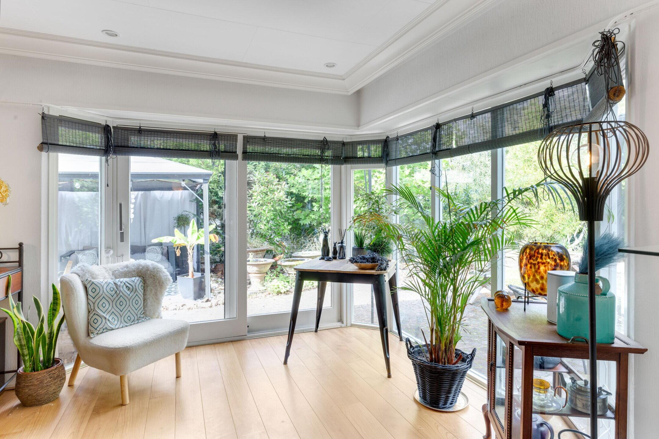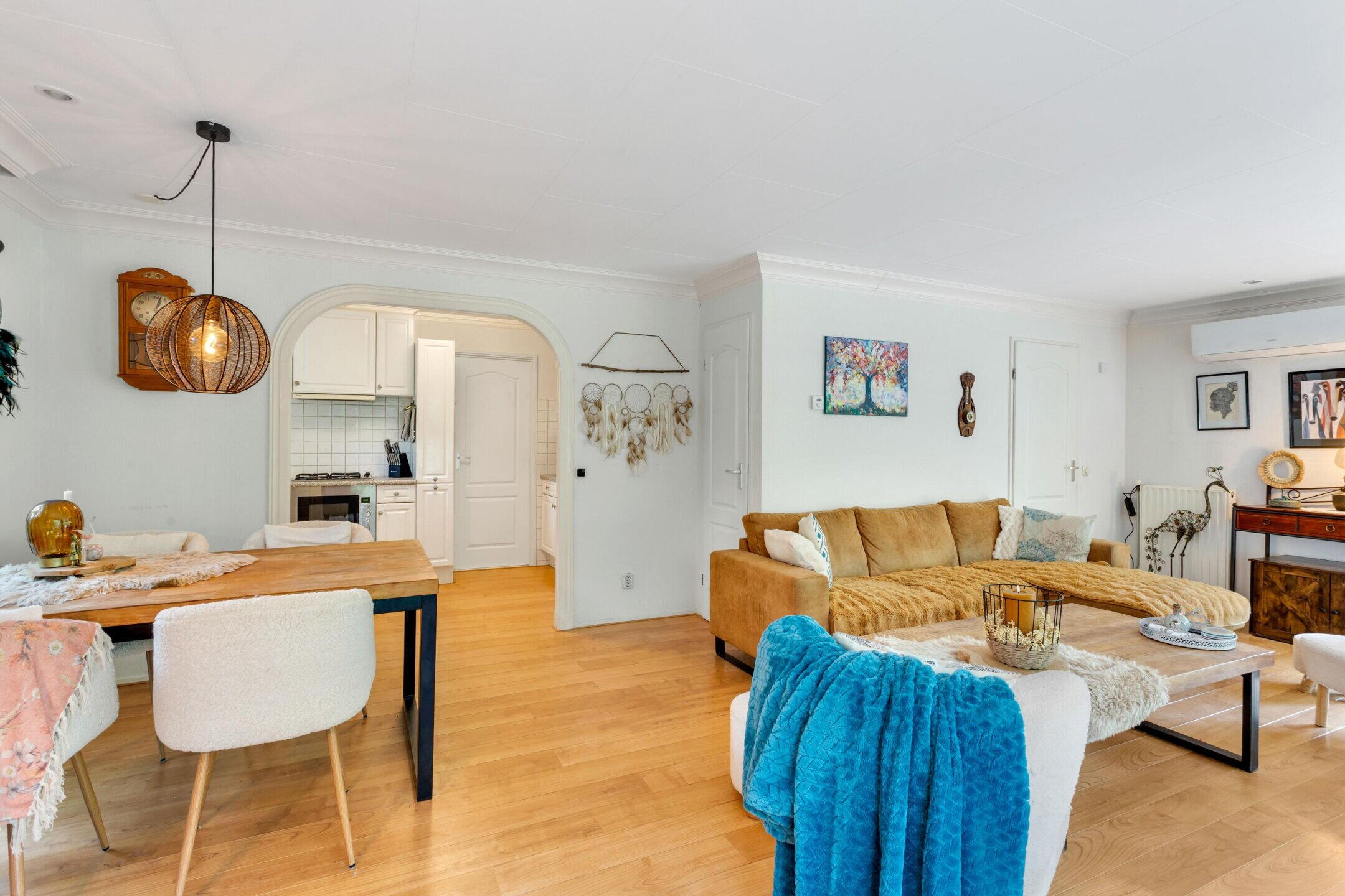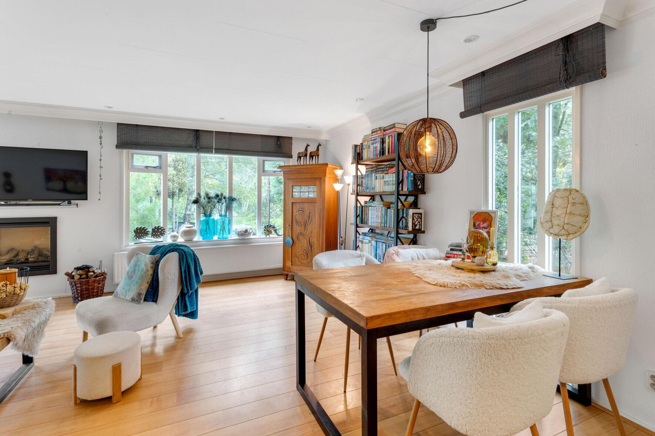 - Woonkamer met schuifpui, airco (koelen & verwarmen) en Faber gashaard