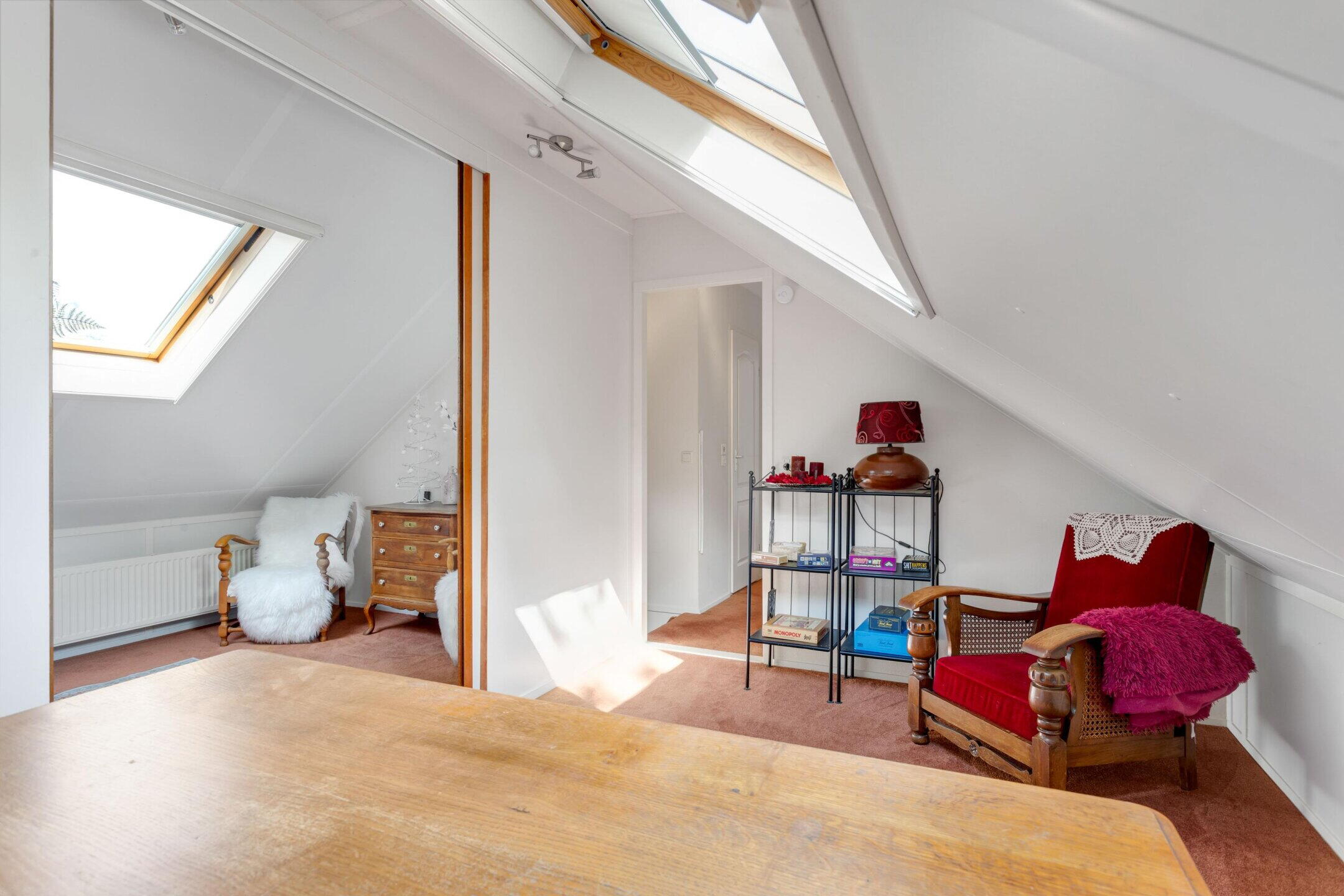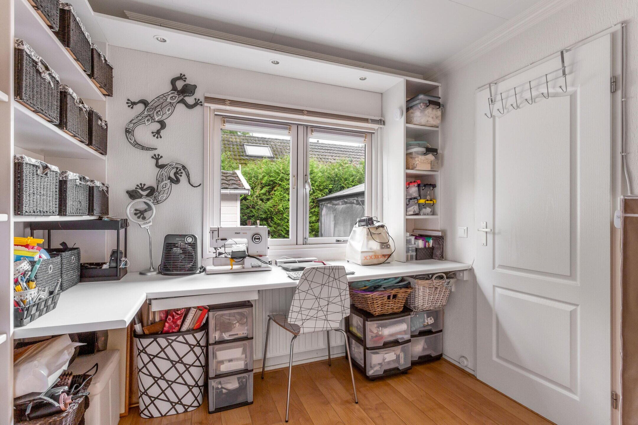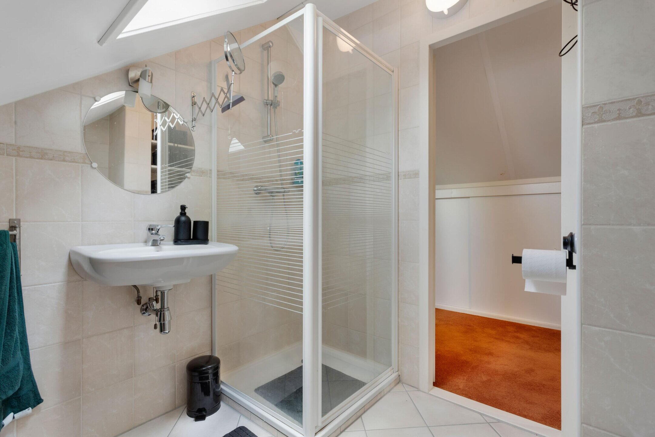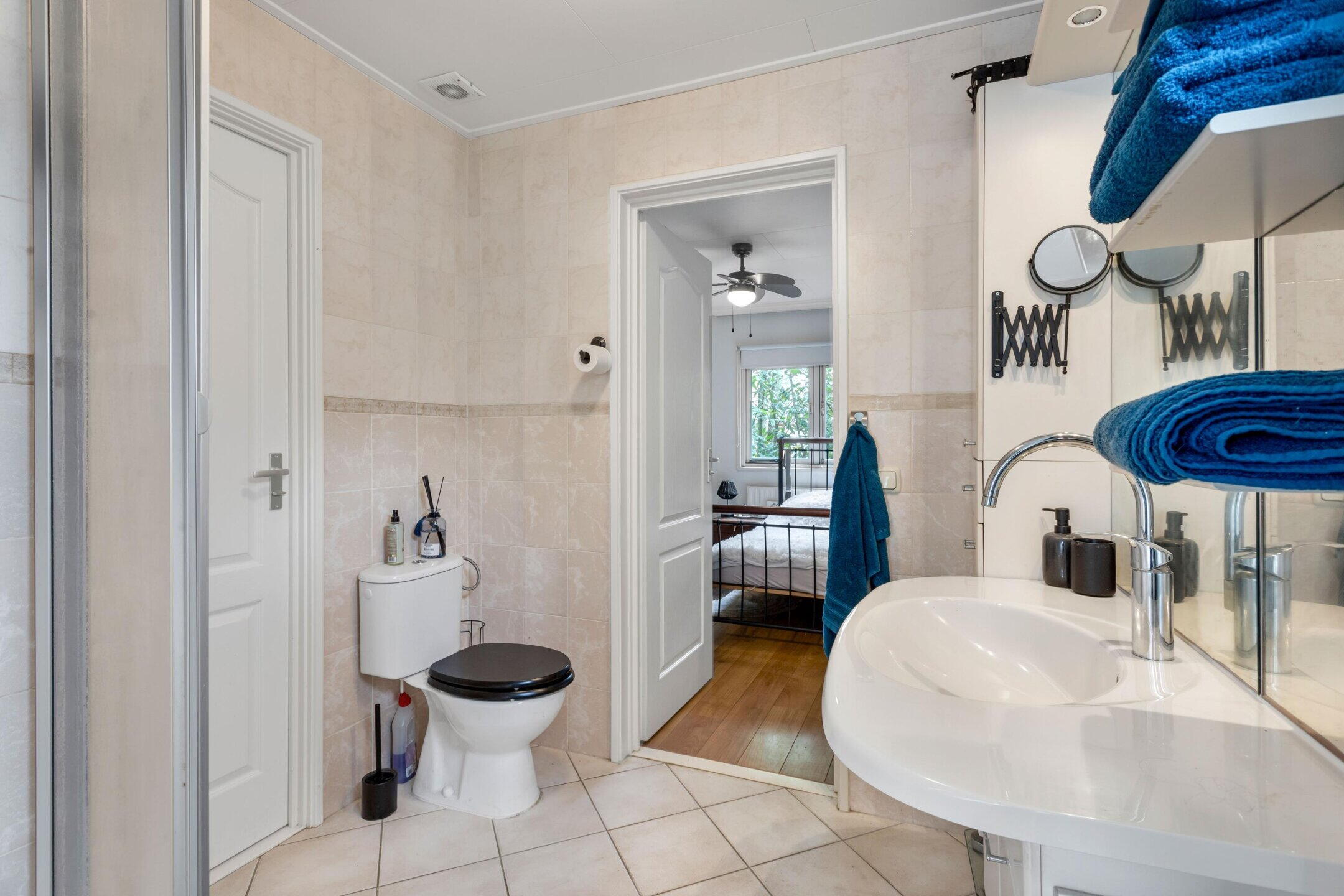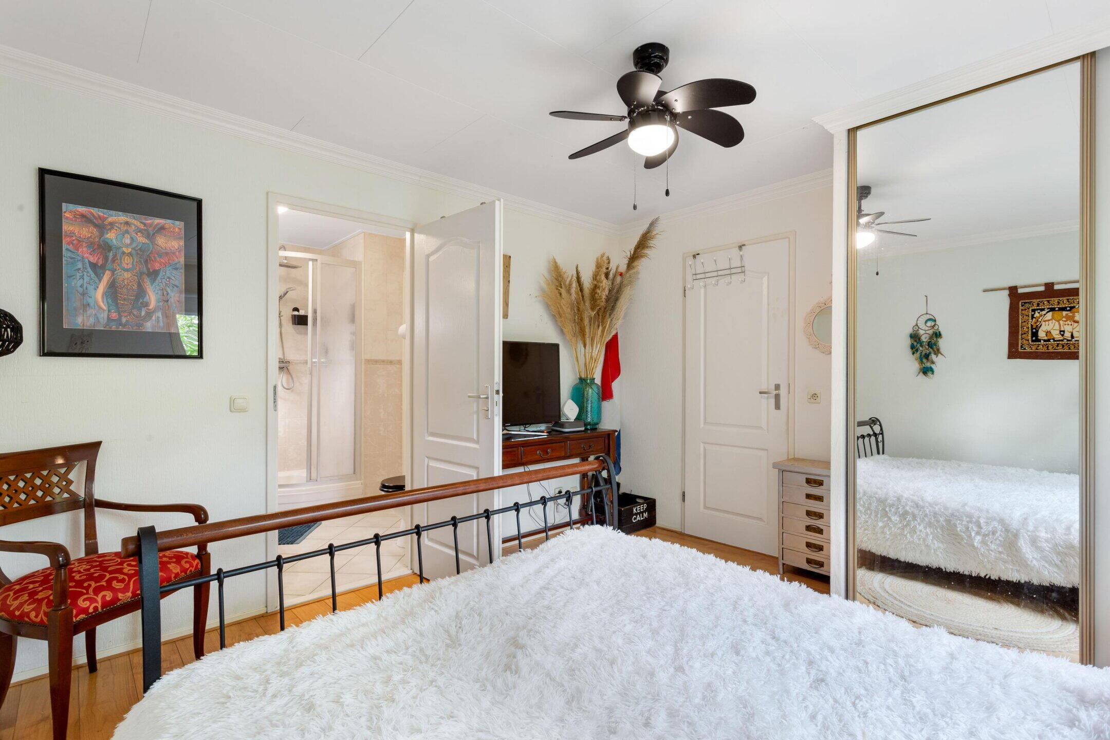 Daarnaast bevinden zich op de begane grond twee slaapkamers, waarvan één uitstekend geschikt is als werk- of hobbykamer. De badkamer beschikt over een douche, wastafel en toilet. Verder zijn er een apart gastentoilet en een praktische wasruimte.